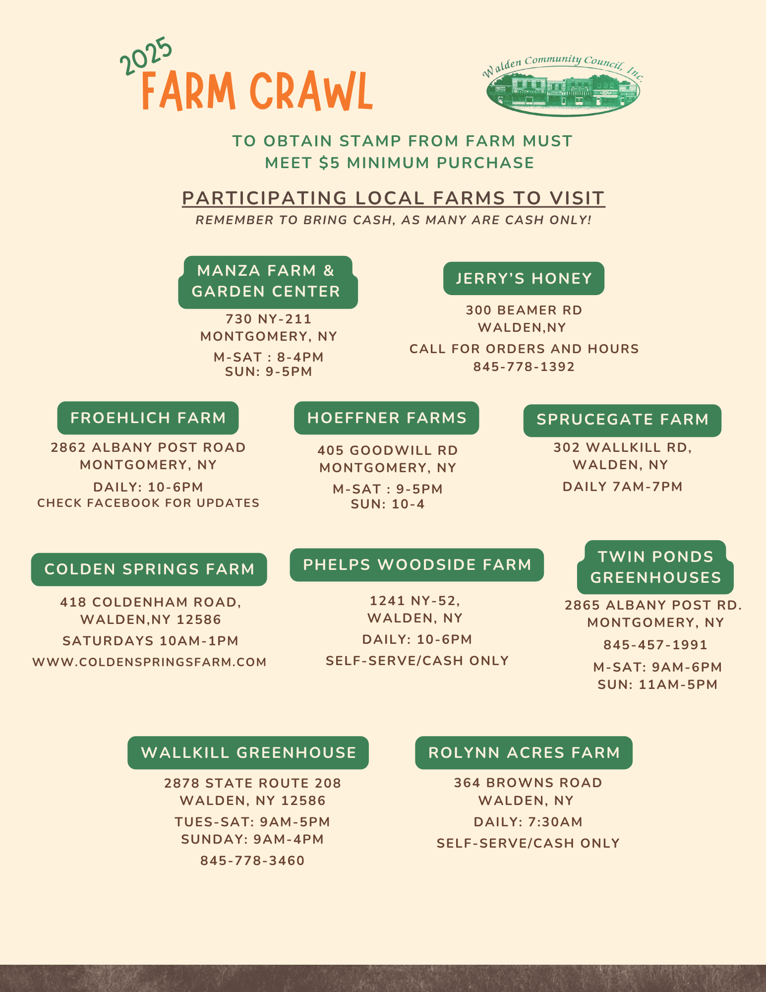 Check out all our local farm stands in the Town of Montgomery by participating in our 2nd Annual Farm Crawl! Pick up a card from the Public Library in Walden, or the Town of Montgomery Offices. Visit the local farms to fill up your stamp card and be entered to win a basket of local goodies! Check out all the participating farms below!